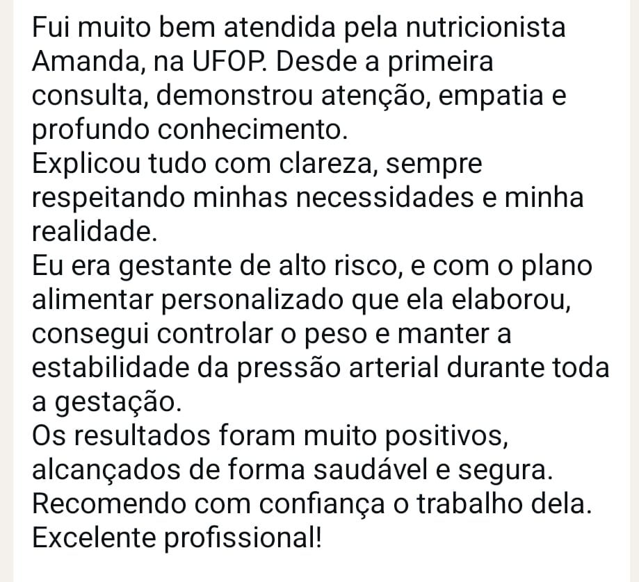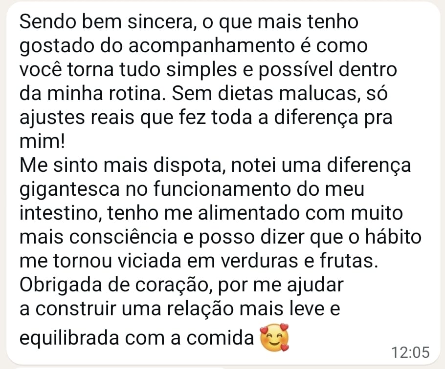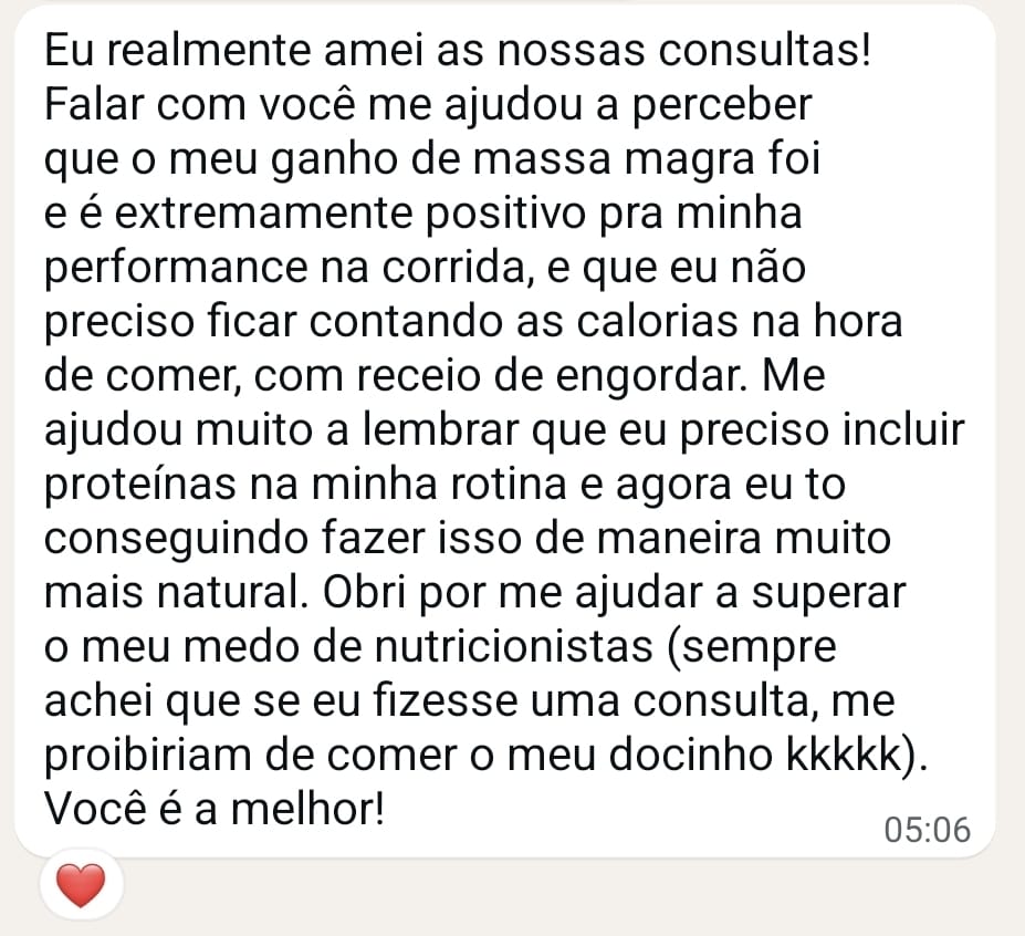Minha maior motivação como nutricionista é guiar meus pacientes pela mudança de hábitos alimentares e para a construção de mais saúde e qualidade de vida.